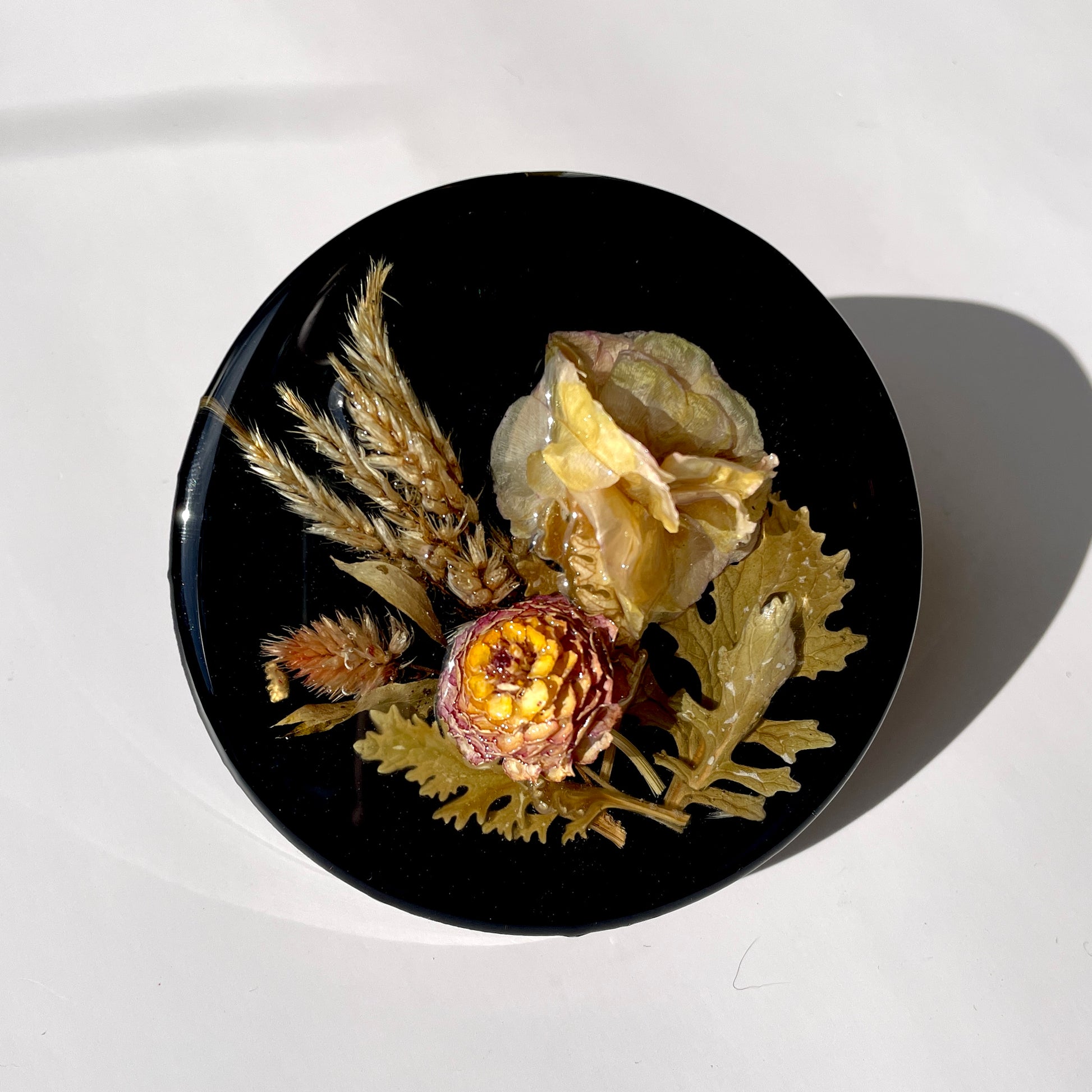 Ranunculus, Celosia, Zinnia, Dusty Miller, Solid Black